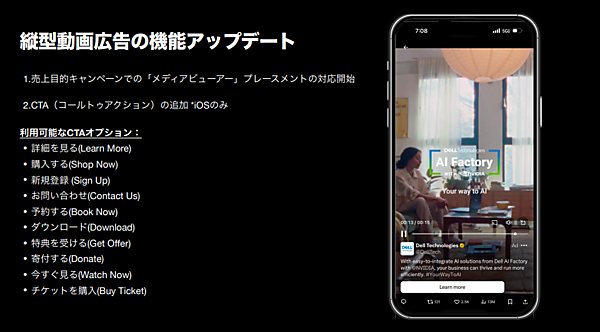 中でも注目すべきは、Xで現在最も人気となっている「縦型動画広告」の機能アップデートだ。売上(コンバージョンの最適化)を目的としたキャンペーンが可能となり、動画から誘導するためのCTA(コールトゥアクション)の数も10種類に増加した。