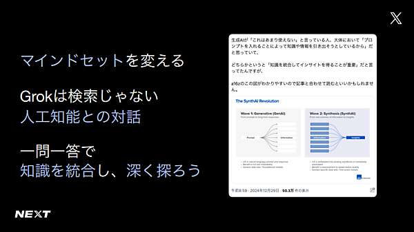 「Grokに何か聞いてみたが、ありきたりな回答しか返ってこない」という声もあるが、そういう方にはAIに対するマインドセットを変えてほしい。Grokは単なる検索エンジンではなく、対話型のエージェントだ。“人々の本音(=インサイト)を深く探る”ためのツールとして、ぜひ有効に活用していただきたい(松山氏)