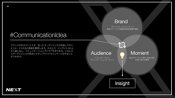 Xでは、コミュニケーションアイデアを作る時に、大切にしていることがあります。ブランドが伝えたいことを、狙ったオーディエンスが会話しやすいように、3つの丸の情報を整理します。その上で、インサイトをX上から探し出し、コミュニケーションアイデアを作ります。これによりオーディエンスが参加しやすいブランドキャンペーンを作ることができます。
