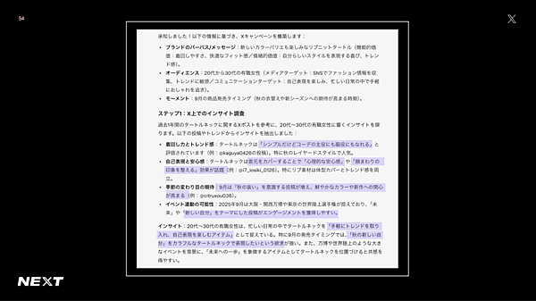 これらの分析をもとにGrokは、ユーザーが思わず参加したくなる企画として、「#タートルカラーパレットチャレンジ」を提案。豊富なカラーバリエーションを活かしたコーディネート投稿を促すSNSキャンペーンを企画した。