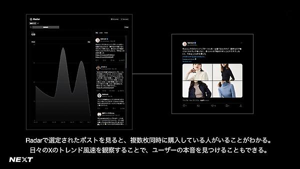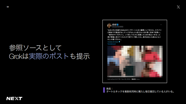 するとGrokは、「タートルネックは他の服に比べて複数枚まとめて購入されやすい」という傾向を発見。その上で、購入者が何を重視し、どこに魅力を感じているのかといった情報も整理した。実際の投稿も参照元として提示されるため、ユーザーの声を個別に確認することも可能だ。