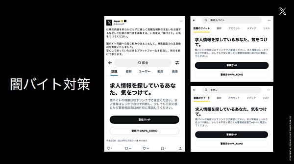 次に「闇バイト」対策についてだ。「高収入バイト」などの関連キーワードを検索すると、注意喚起のバナーが表示される仕組みを導入している。