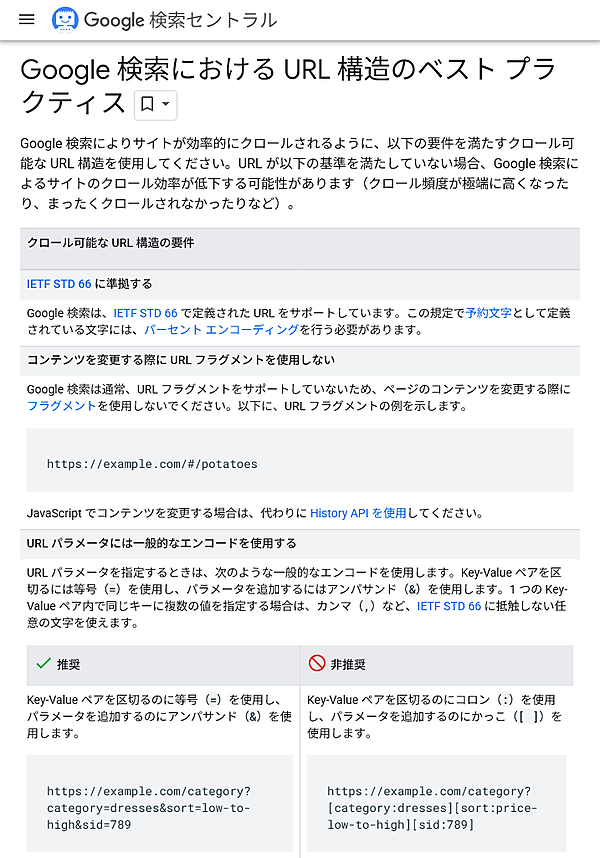Google検索におけるURL構造のベストプラクティスが書かれているドキュメントなので、読んだことがなければ必ず読んでおこう。読んだことがあっても再確認のため読むのもいいだろう。