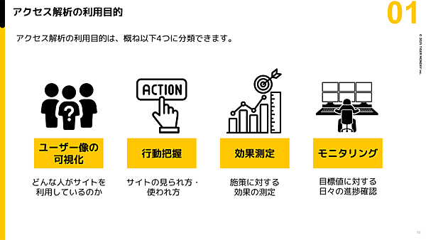 そして、アクセス解析の利用目的としては、主に以下の4つが挙げられる。