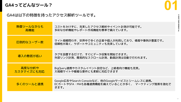 まず解説されたのが、GA4の「特徴」だ。言うまでもなく、GA4はWebアクセスを解析し、「どんな人が(Who)、どこから(Where)、どんなページを閲覧し(What)、どのくらい目標を達成したか(How Much)」を明らかにするためのツールである。