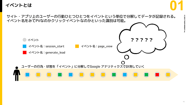 そもそもGA4における「イベント」とは、サイトないしアプリ上のユーザー行動1つ1つを記録していくための単位だ。通常であれば、ユーザーが何かしらの行動をとると、「session_start」「page_view」「click」などのイベントが連鎖的に発生し、Google アナリティクスで計測されていく。
