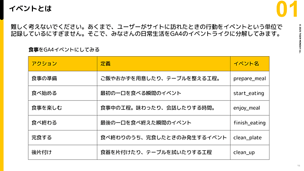 食事の準備は「prepare_meal」、最初の一口目は「start_eating」、食べ終われば「finish_eating」といったように記録できます。そして残さず完食であれば「clean_plate」──これがある種のコンバージョンですね。このように、ユーザーの一連の行動は、イベント単位で細分化することができます(西氏)