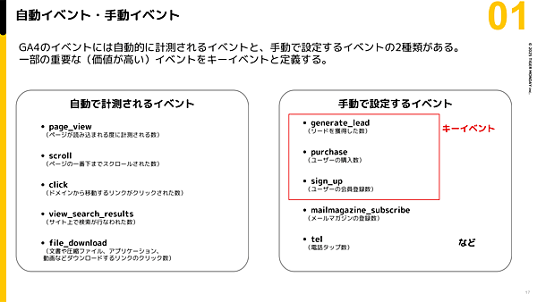 また、GA4のイベントは、「システム側で自動的に計測されるイベント」と、「ユーザーが手動で設定するイベント」に分かれる。さらに、一部の重要な(Webサイトの目標となる)イベントは、「キーイベント」と定義される。