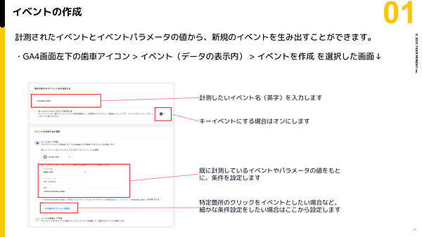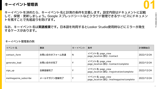 なお、設定したキーイベントは、部署内で共有・更新できるよう、クラウド上で管理表としてまとめておくのが望ましい。キーイベント名は英語推奨。日本語を利用すると、外部ツールとの連携時にエラーが発生してしまうので注意が必要だ。