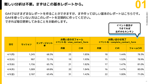 GA4への移行により、多種多様な計測レポートを作れるようになったが、「まずは基本となるレポートを作るべきだ」と西氏。下図は、お問い合わせフォームのCV計測を目的としているサイトの例だ。
