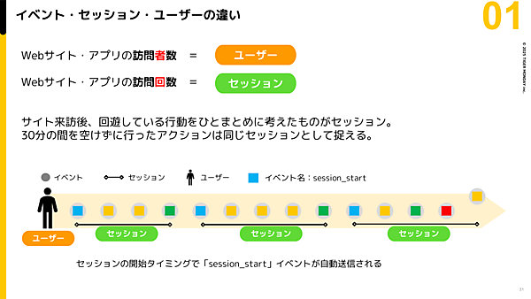 GA4では、30分の間を空けずに行ったアクションは1つのセッションとして扱われ、それを過ぎた場合は別のセッションとしてカウントされる。そしてセッション開始時には「session_start」のイベントが記録される。