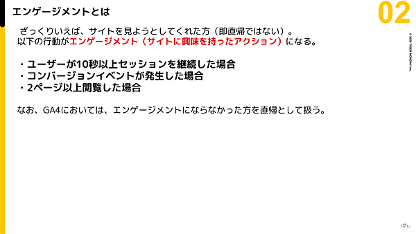 また、「エンゲージメント」とは、サイトに対して興味を持ったとされるユーザー行動のことだ。GA4においては、以下のような場合がエンゲージメントと定義され、そうでない方を「直帰」として扱う。