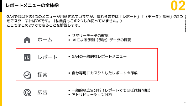 GA4のレポート機能には4つのメニューがあるが、このうち重要なのは「レポート」と「探索」だ。西氏自身も、基本的にはこの2つしか使っていないという。