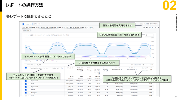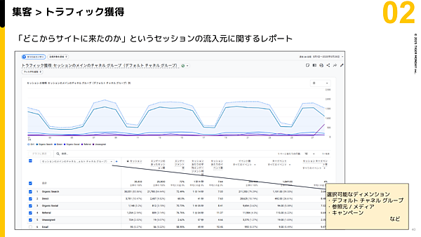 「集客>トラフィック獲得」のレポートでは、「どこからサイトに来たのか」「集客施策の効果」を確認できる。ディメンション(項目)は主に以下の3つから選ぶ。