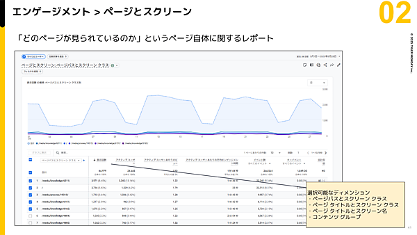 「エンゲージメント>ページとスクリーン」のレポートでは、「どのページがどれだけ見られているのか」を確認できる。ディメンションは、主に以下の4つから選ぶ。