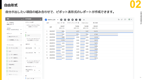 「探索」は、さまざまなディメンション・指標を組み合わせ、レポートをカスタマイズする機能だ。こちらも複数の機能があるが、ここでは特によく使われる「自由形式」について解説する。