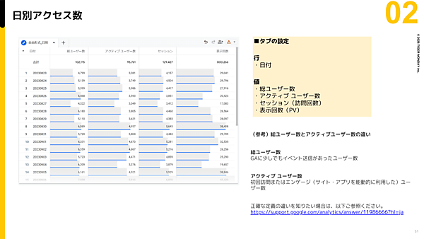 - 日別アクセス数を知りたい場合:行に「日付」、値に「総ユーザー数」「アクティブユーザー数」「セッション」「表示回数」を設定。