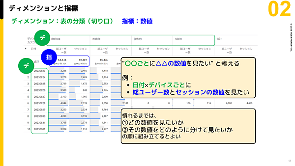 例:「日付とデバイスごとに総ユーザー数とセッションの数値が見たい」