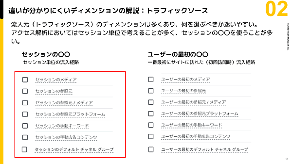 また、流入元のディメンションは多くあり、何を選ぶべきか迷いやすい。西氏は、慣れないうちは「ユーザーの最初の○○」は無視し、「セッションの○○」だけを活用するのがベターだとした。