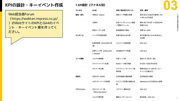 例として、「Web担当者ForumのWebサイトのKPIとGA4のイベント・キーイベント案を作ってください」と入力すれば、下図のようなKPI設計とイベントの定義案がすぐに出力される。