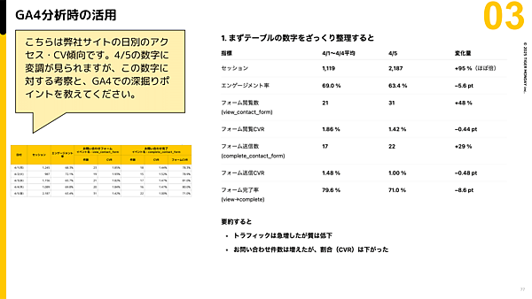 さらに、収集したデータの分析にもChatGPTが活用できる。レポートをChatGPTに読み込ませ、「こちらは弊社サイトの日別のアクセス・CV傾向です。4/5の数字に変調が見られますが、この数字に対する考察と、GA4での深掘りポイントを教えてください」と入力すると、簡単な分析をしてくれる。