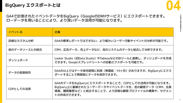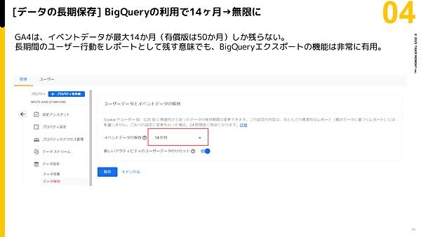 また、GA4はGoogleのビッグデータ解析サービス「BigQuery(ビッグクエリ)」と合わせて使われることが多い。GA4からBigQueryへデータをエクスポートすれば、CVしたユーザーの「ゴールデンパス分析」などが可能となる。データの保存期間が無制限化するのも大きなメリットだ。