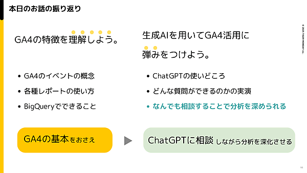 西氏は「ChatGPTは頼れる相談相手だが、その力を最大限に活かすにはGA4の基本をおさえることが不可欠。基礎を理解して分析を深め、今後の仕事にぜひ役立ててほしい」と語り、講演を締めくくった。
