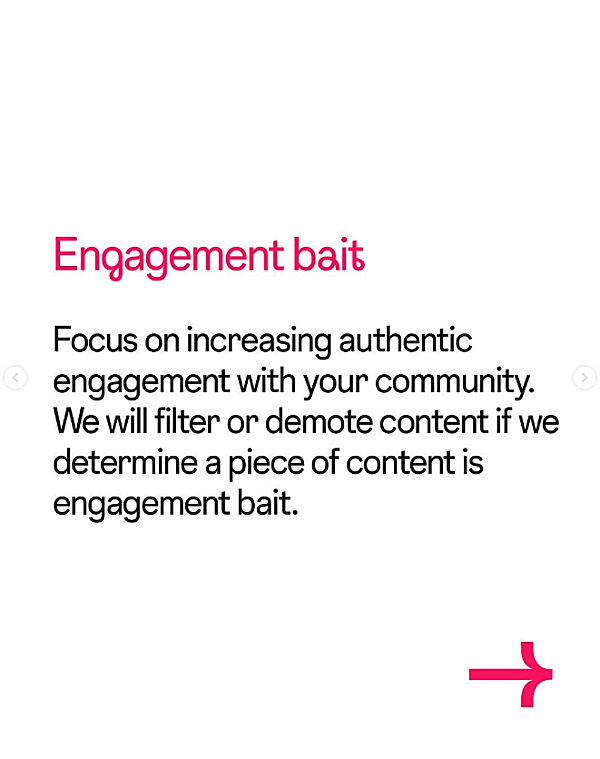 投稿がエンゲージメントベイト(餌、誘い文句)であると判断した場合は、表示を制限したり、フィード上の優先度を下げたりすることがあります。ユーザーは、Instagram上で「いいね」や「シェア」、「コメント」などのアクションを誤解させたり、誘導したりする投稿を好みません。