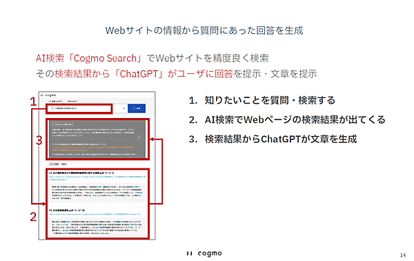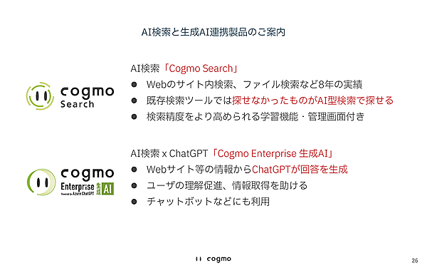 アイアクトが提供する「Cogmo Search」および生成AIを連携した「Cogmo Enterprise 生成AI」は、こうした変化を実現可能にするソリューションだ。既存のサイトにJavaScriptのタグを設置するだけで導入でき、学習期間も2週間~1.5ヶ月と短く、導入を検討しやすい。