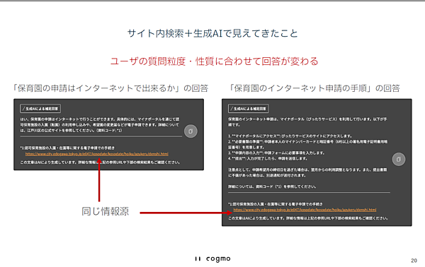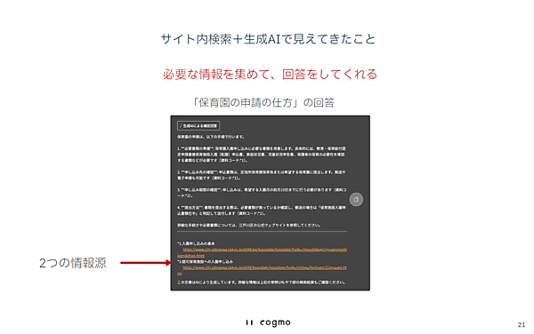 たとえば、「保育園の申請はインターネットでできるか?」と検索した場合、生成AIは概要的な回答として「インターネットでの申請は可能です」と簡潔に要約された情報を提示する。
