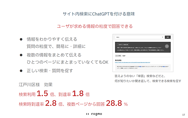 ChatGPTのような生成AIをサイト内検索に活用することで、ユーザーの意図に沿った情報提供が可能になり、Web体験そのものが大きく進化するというのが西原氏の主張だ。
