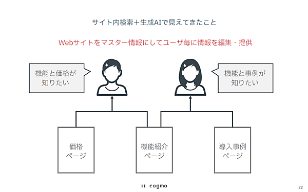 そうした手法に対して、検索精度の高いAIと生成AIを組み合わせると、マスター情報として存在するWebページ群から、ユーザーの問いに応じてリアルタイムで必要な情報を抽出・編集して提示できる。結果として、CMS側で属性別にパーツを用意し、シナリオごとに出し分けるようなパーソナライズ設計は、極端に言えば不要となる。