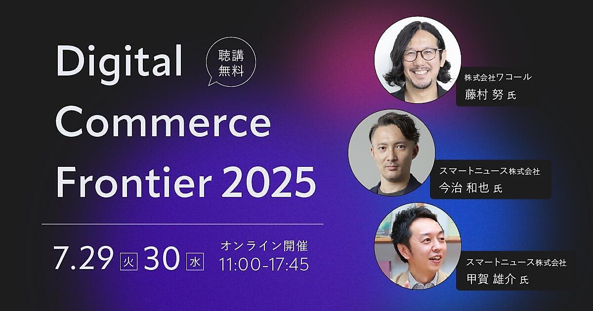 7月29日(火)+30日(水)に、デジタルコマースに関わる人必見の大型オンラインイベント「Digital Commerce Frontier 2025」を開催。ワコール、スマートニュース、ZOZO、中川政七商店、アスクル、パルコ、アシックスなど著名企業の成功事例や実践的な知見を学べるさまざまなセミナーを用意しています。