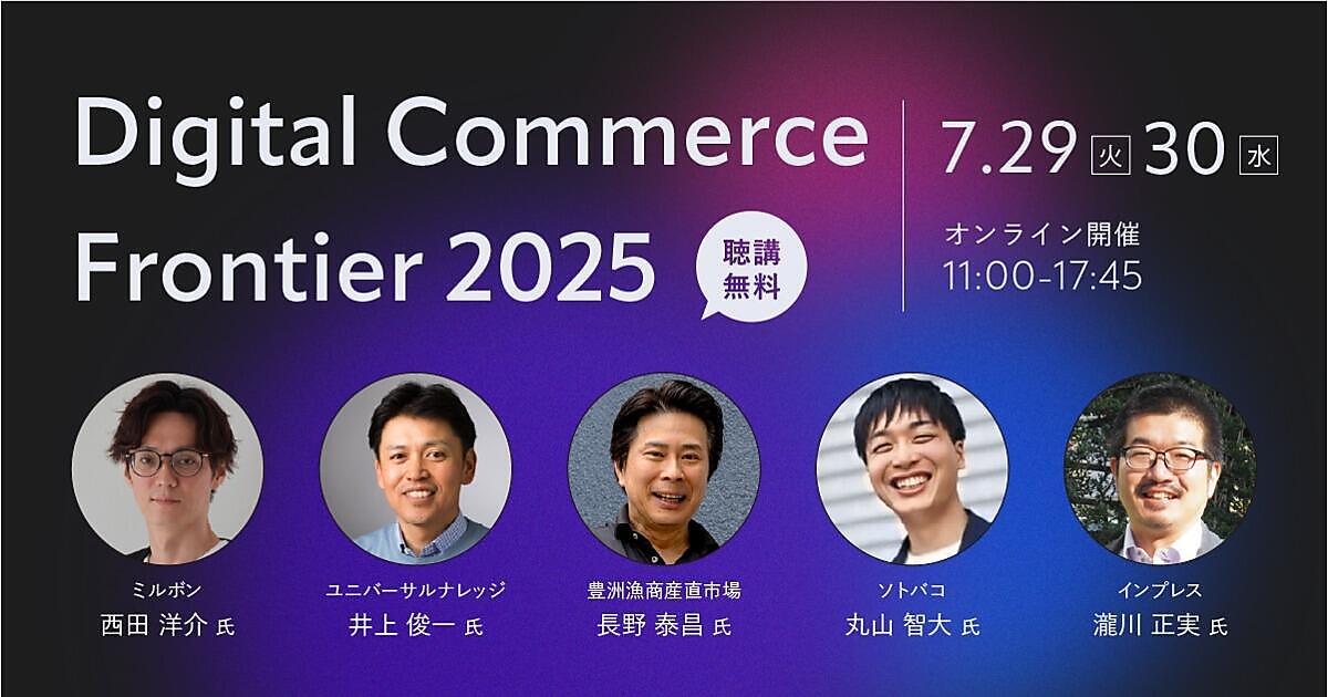 7月29日(火)+30日(水)に、デジタルコマースに関わる人必見の大型オンラインイベント「Digital Commerce Frontier 2025」を開催。ミルボン、豊洲漁商産直市場、ワコール、スマートニュース、ZOZO、中川政七商店、アスクル、アシックスなど著名企業の成功事例や実践的な知見を学べるさまざまなセミナーを用意しています。
