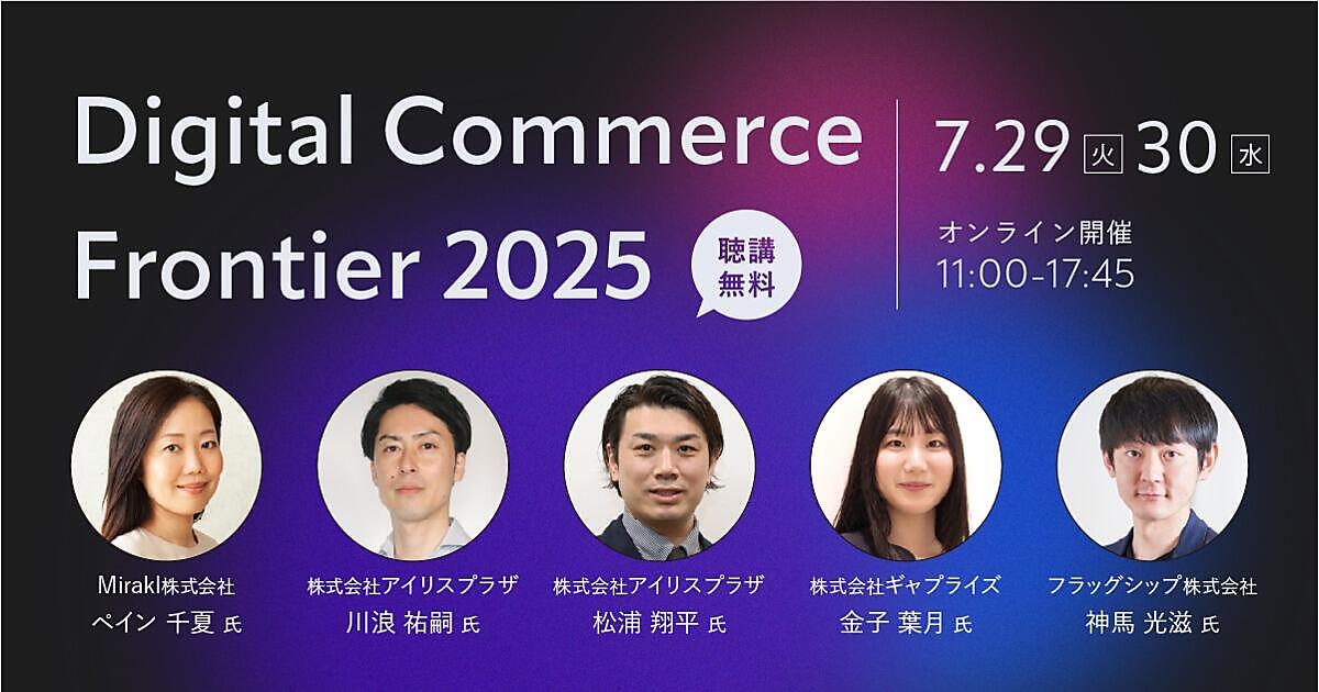 7月29日(火)+30日(水)に、デジタルコマースに関わる人必見の大型オンラインイベント「Digital Commerce Frontier 2025」を開催。ワコール、スマートニュース、ZOZO、中川政七商店、アスクル、パルコ、アシックスなど著名企業の成功事例や実践的な知見を学べるさまざまなセミナーを用意しています。