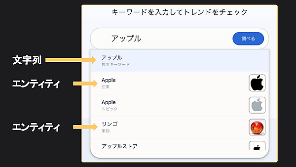 Google トレンドを使うと、Googleがエンティティをどのように認識しているのかがわかる。次図のように、Googleトレンドで「アップル」と入力すると、「Apple」という企業のエンティティ、「リンゴ」という果物のエンティティも表示され、それぞれの検索ボリュームを見ることができる。これは、「アップル」が、企業、果物のエンティティとして理解されていることの表れだ。
