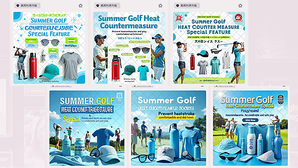 夏のゴルフ対策をテーマにした広告バナー。背景には青空の下でゴルフをしている男女の写真。中央に大きく「夏ゴルフ 暑さ対策特集」という文字があり、黄色と黒のハイライトで「熱中症を防いで快適・安全プレー!」と書かれている。商品としてサングラス、冷感シャツ、帽子、水筒、UVスプレーなどが並び、それぞれに「冷感」「UV」「水分補給」のラベルが付いている。全体は涼しげな青系の配色で、スポーティで清涼感のあるデザイン。