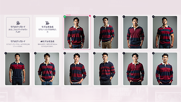 そこで「AdCreative.ai」を活用し、要望に沿うAIモデルを生成。プロンプトには「20代。ガッチリめのアメカジが似合うさわやか日本人青年」と入力した。すると数分で、AIモデルが複数生成される。