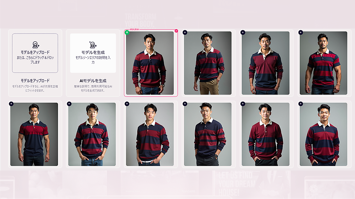 この中から理想とするモデルを選び、さらに商品画像のアイテムをAIモデルに着用させるといった微調整やブラッシュアップを加えると、30分~1時間程度で完成したという。