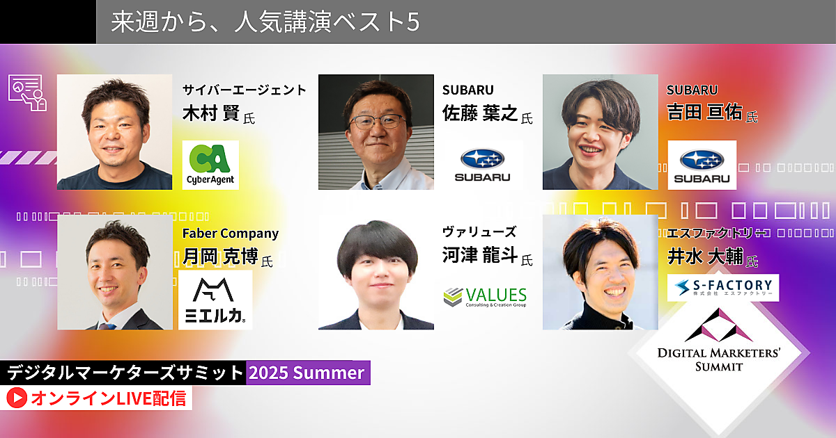 サイバーエージェント、SUBARU、キヤノンMJ、リコーなどが登壇する「デジタルマーケターズサミット 2025 Summer」を8月26日(火)にオンラインで開催します。