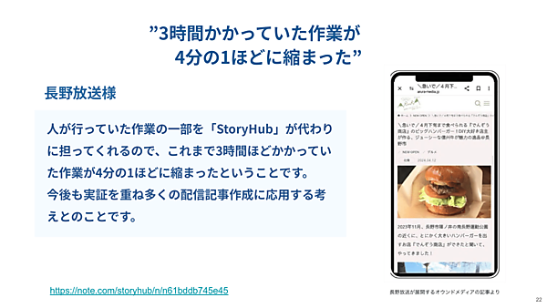 ローカル局の長野放送では、StoryHubの導入で、約3時間かかっていた作業工程が1/4ほどに短縮。残業が大幅に減り、労働組合でも話題になった。