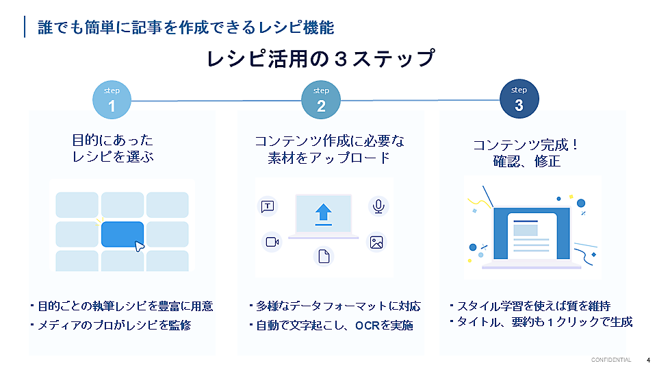 目的にあったレシピを選択し、取材で得た音声データや画像などの素材をアップロードするだけで、簡単に記事を制作できる。リサーチ、文字起こし、原稿執筆、レビューまでが一気通貫で支援され、人間はクリエイティブな領域に集中できるため、コンテンツの質を保ちつつ業務効率化を実現できる。
