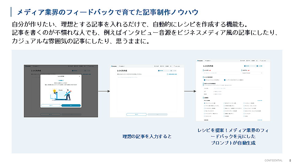 田島 また自分が作りたい、理想とする記事を入れるだけで、自動的にその記事のレシピを作成する機能もあります。記事を書くのが不慣れな人でも、例えばインタビュー音源をビジネスメディア風の記事にしたり、カジュアルな雰囲気の記事にしたり、思うままに作ることができます。
