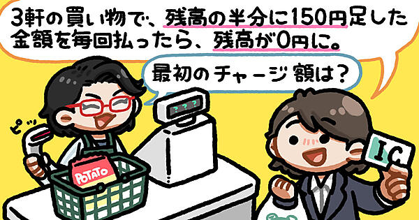 Q1. 3店舗でそれぞれ、その時に持っていたお金の半分に150円を足した金額を使った結果、交通系ICカードの残高が0円になりました。最初にいくらチャージされていましたか。