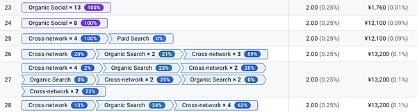 下の画像はGA4の「アトリビューションパス」レポートの画面です。当時もこれと同じような形で、コンバージョンに至るまでのクリックの経路を可視化できました。こうしたデータを使って各広告媒体の予算配分の最適化に役立てていたんです。