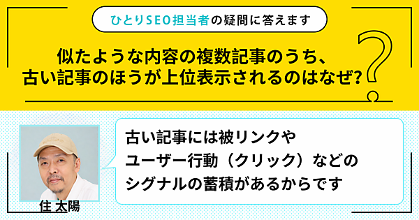 ひとりで頑張るSEO担当者さんの悩みに答える本連載。今回の質問は「似たような内容の複数記事のうち、古い記事のほうが上位表示されるのはなぜ?」です。この回答は「古い記事には被リンクやユーザー行動(クリック)などのシグナルの蓄積があるからです」です。