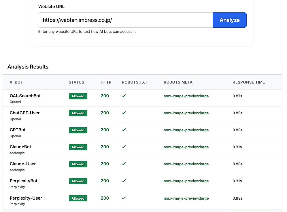 前出のソリス氏は、AIクローラーのアクセスを許可しているか拒否しているかを簡易的に調査するツールを紹介している。