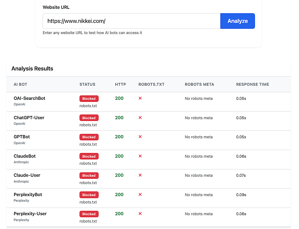GoogleのAIクローラーであるGoogle-Extendedなど他社のAIクローラー対象になっていない。またrobots.txtでの制御だけを調べているため、サーバー側で特殊な挙動をしている場合は判断できない。