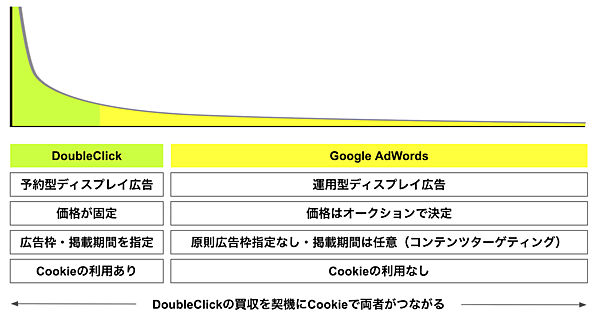 佐藤:これまでDoubleClickは、主要なポータルサイトのトップページなど、ロングテール理論の「ヘッド」の部分(下の図の緑色)の広告枠を中心に利用されてきました。そして、Cookieを使って広告の配信をコントロールする技術を保有していました。