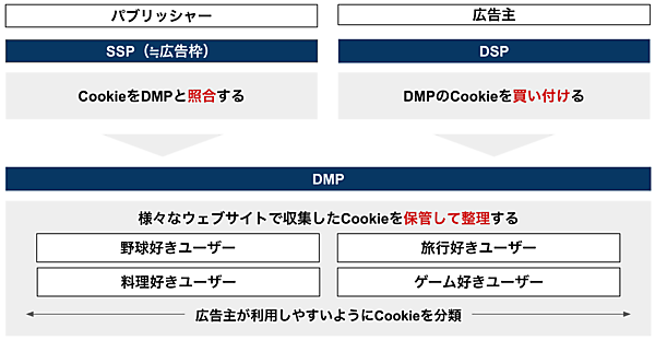 DMP(ディーエムピー Data Management Platform):ユーザーの行動データを収集・管理するシステム。ユーザーのウェブサイトの閲覧履歴などを基に「野球好き」「旅行好き」などとユーザーをグループ化する。分類はCookie情報を基に行う。